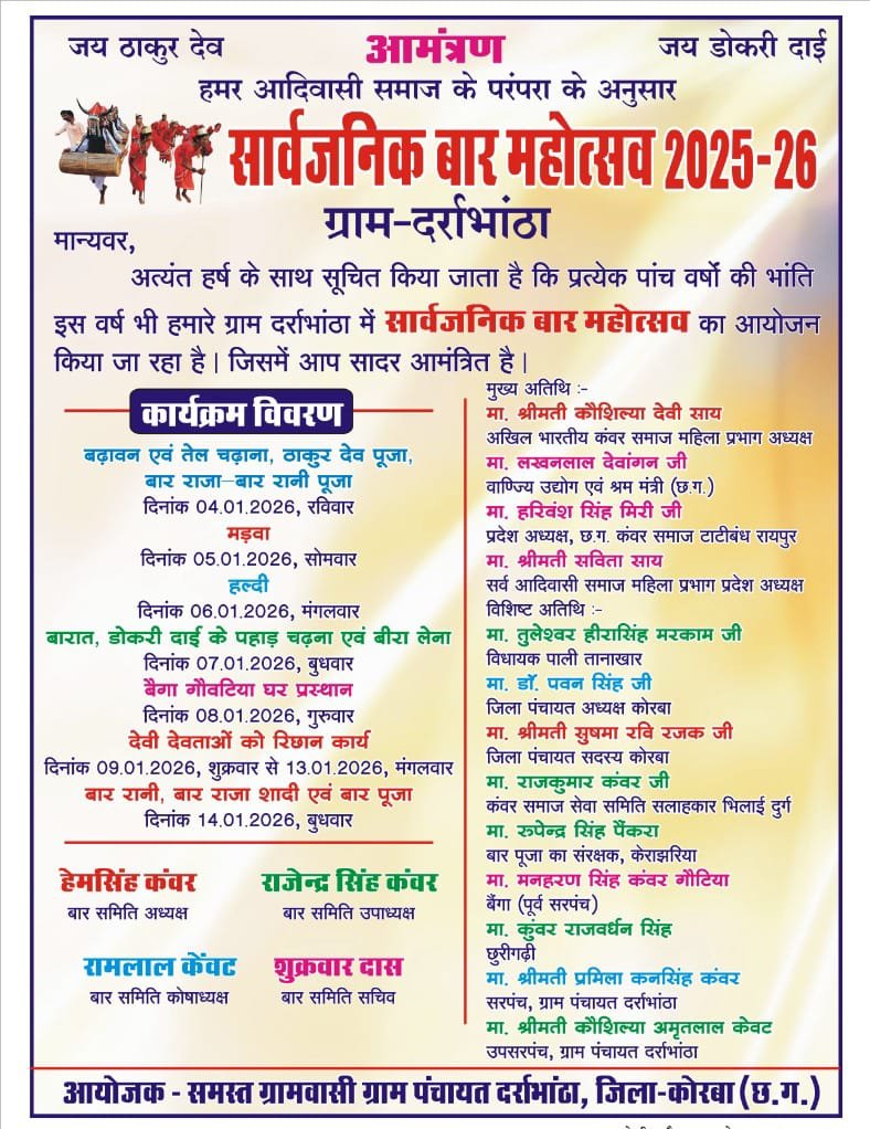छत्तीसगढ़ के कोरबा जिले अंतर्गत ग्राम दर्शभांटा में कंवर आदिवासी समाज की प्राचीन परंपराओं के अनुसार सार्वजनिक बार महोत्सव (बार नृत्य एवं संबंधित अनुष्ठान महोत्सव) का आयोजन 4 जनवरी 2026 से 14 जनवरी 2026 तक बड़े उत्साह के साथ किया जा रहा है।
