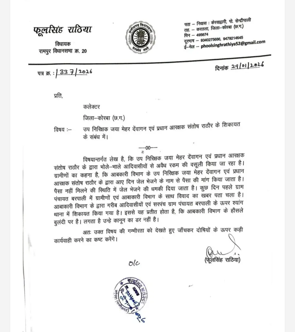 कोरबा, 29 जनवरी 2026 (विशेष संवाददाता): छत्तीसगढ़ के कोरबा जिले के वनांचल इलाके में आबकारी विभाग के दो अधिकारियों पर भोले-भाले आदिवासी ग्रामीणों से जबरन पैसे वसूलने का संगीन आरोप लगा है। रामपुर विधानसभा क्षेत्र के विधायक फूलसिंह राठिया ने इस मामले को गंभीरता से लेते हुए जिला कलेक्टर को पत्र लिखकर तत्काल निष्पक्ष जांच और दोषी अधिकारियों के खिलाफ सख्त कार्रवाई की मांग की है। विधायक के इस पत्र ने स्थानीय स्तर पर हड़कंप मचा दिया है और आदिवासी समुदाय में भय का माहौल पैदा हो गया है।