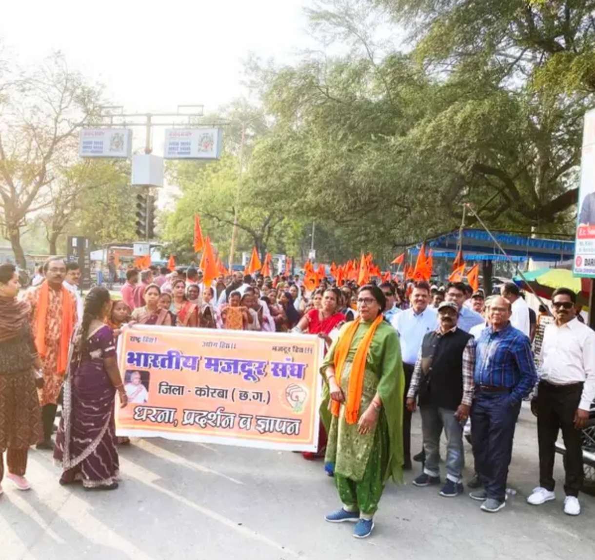सुबह से ही कोरबा जिला मुख्यालय में केसरिया झंडों और बैनरों से सजी भीड़ उमड़ पड़ी। “राष्ट्र हित-उद्योग हित-मजदूर हित” जैसे नारों के साथ महिलाओं और पुरुष श्रमिकों ने जुलूस निकाला। हाथों में पोस्टर थामे कार्यकर्ता नारे लगाते हुए कलेक्ट्रेट पहुंचे, जहां जिला मजिस्ट्रेट को ज्ञापन सौंपा गया।